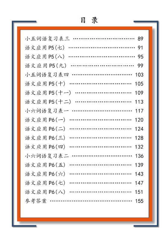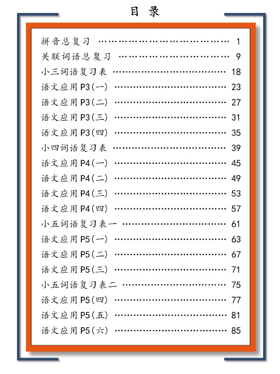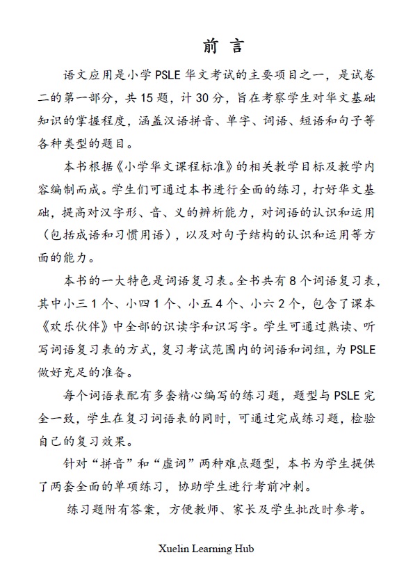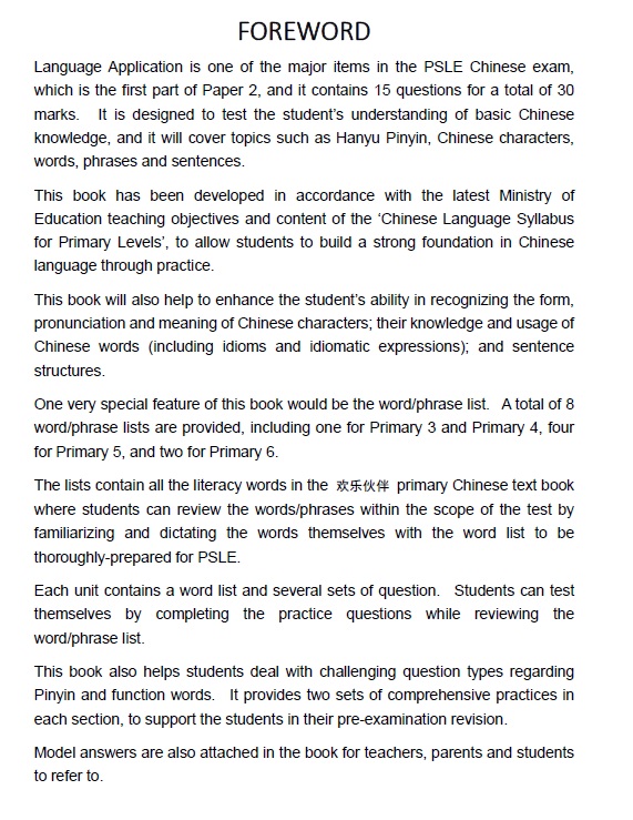 (包括成语和习惯用语),以及对句子结构的认识和运用等方 面的能力。本书的一大特色是词语复习表。全书共有8 个词语复习表,其中小三1 个、小四1 个、小五4 个、小六2 个,包含了课本 《欢乐伙伴》中全部的识读字和识写字。学生可通过熟读、听写词语复习表的方式,复习考试范围内的词语和词组,为PSLE 做好充足的准备。